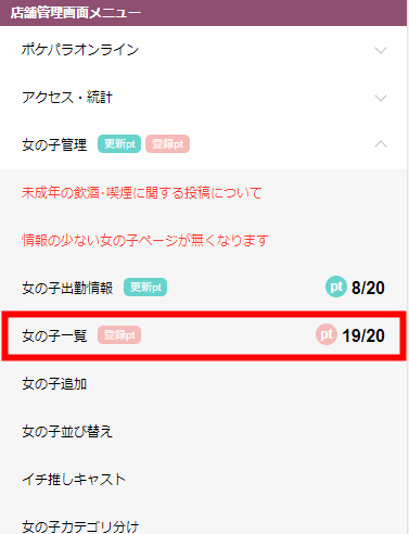▼トップメニューの【女の子管理】の中に【女の子一覧】があります。