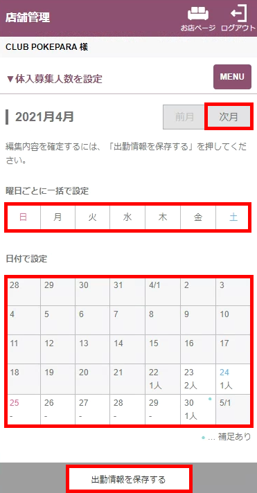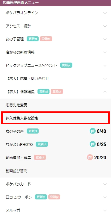 ▼トップメニューの【【求人】情報編集】の中に【体入募集人数を設定】があります。