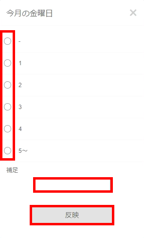 設定したい曜日、日付をクリックすると人数を選択することができます。補足がある場合は文字入力することができます。選択、入力後は「反映」をクリックしてください。