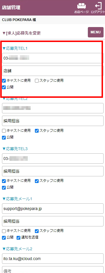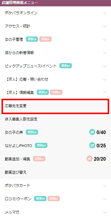 2021年4月23日 【求人】情報編集 応募先を変更 ポケパラ体入の応募先を変更できます。 応募先を登録・変更する ▼トップメニューの【【求人】情報編集】の中に【応募先を変更】があります。 【簡単アクセス】➡https://sp.pokepara.jp/shopc_manage/info/edit.html#job_info 【求人】応募先を変更 応募先TEL、メール、LINE、ホームページ、それぞれ3つ登録することができます。必要な情報を入力して設定が完了したら一番下の「登録」をクリックしてください。