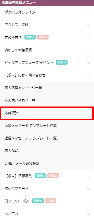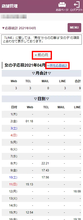 スタッフ求人の応募統計を確認する場合は「⇒男性応募統計」をクリックすると確認できます。「LINEからの応募」に関しては女の子応募と合わせて表示されています。