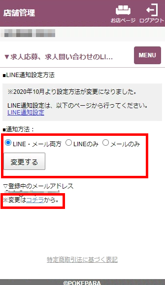通知方法を選択し、「変更する」をクリックする。登録中のメールアドレスを変更する場合は「※変更はコチラから」をクリックするとメールアドレスを変更することができます。