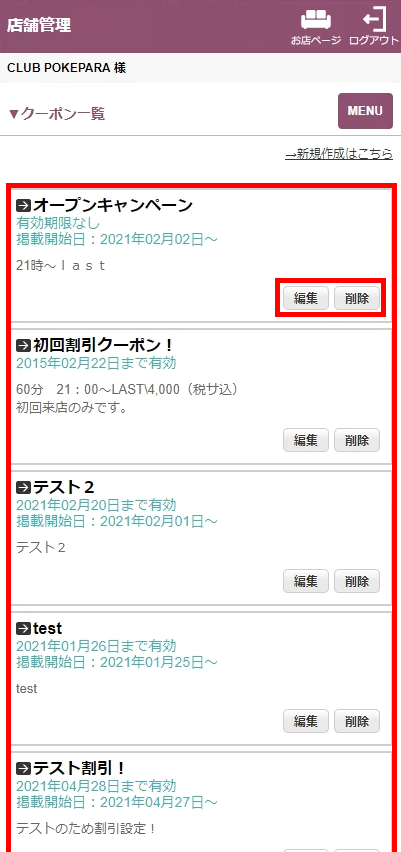 編集するクーポンの「編集」をクリックしてください。「削除」をクリックすると登録から削除できます。