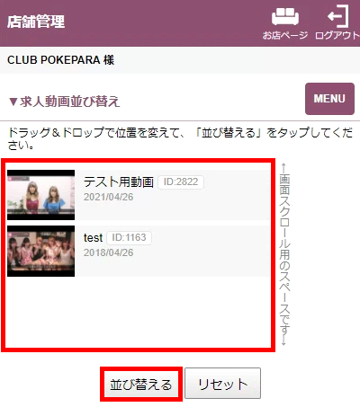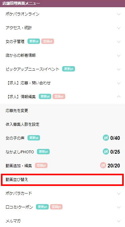 ポケパラ体入のお店ページの動画を並び替えることができます。