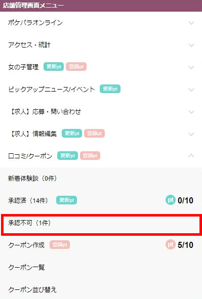▼トップメニューの【口コミ/クーポン】の中に【承認不可】があります。