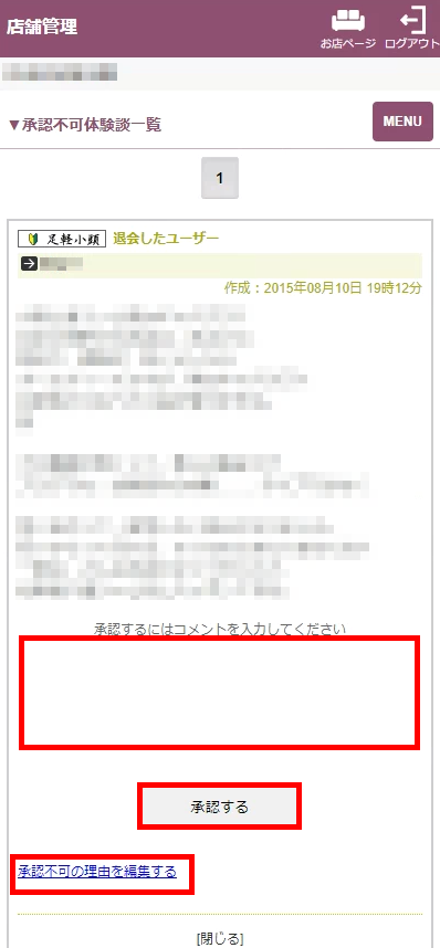 承認不可にした体験談を承認する場合は、お礼やコメントを入力して「承認する」ボタンをクリックしてください。
