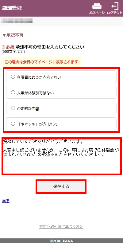 「承認不可の理由を編集する」場合は選択項目にチェックしてコメントを書いて、「保存する」をクリックしてください。コメントのみでも保存できます。