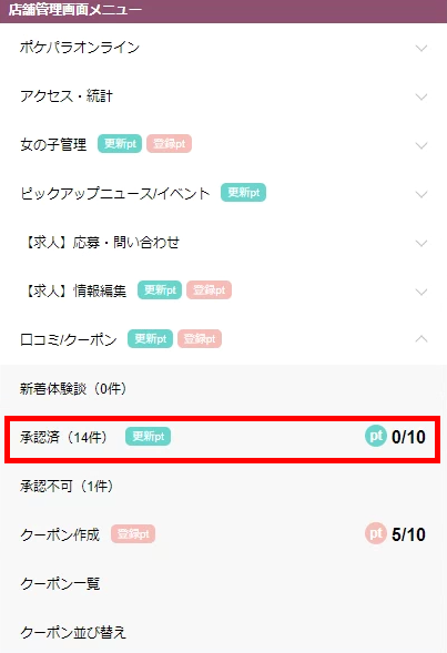 ▼トップメニューの【口コミ/クーポン】の中に【承認済】があります。