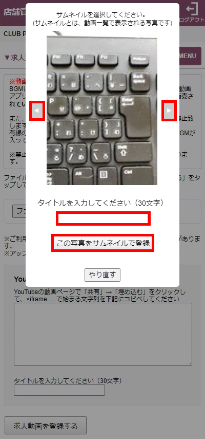 動画一覧で表示させたい画像を選択し、タイトルを入力してください。「この写真をサムネイルで登録」をクリックすると動画が登録されます。
