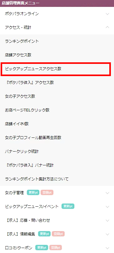 ▼トップメニューの【アクセス・統計】の中に【ピックアップニュースアクセス数】があります。