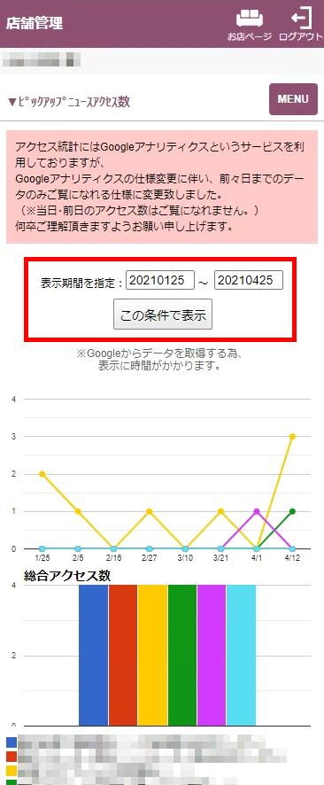 ピックアップニュースのアクセス数を表示期間内の合計、日別で表示します。