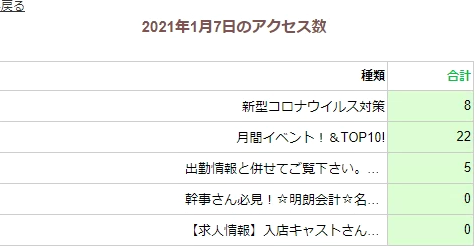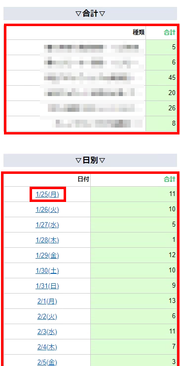 記事ごとのアクセス数の合計が確認でき、日別は日付をクリックするとその日の記事ごとのアクセス数の表が表示されます。