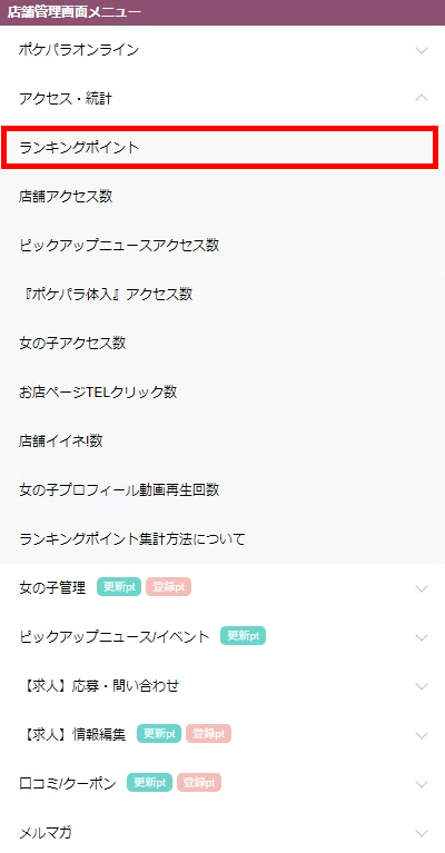 ▼トップメニューの【アクセス・統計】の中に【ランキングポイント】があります。