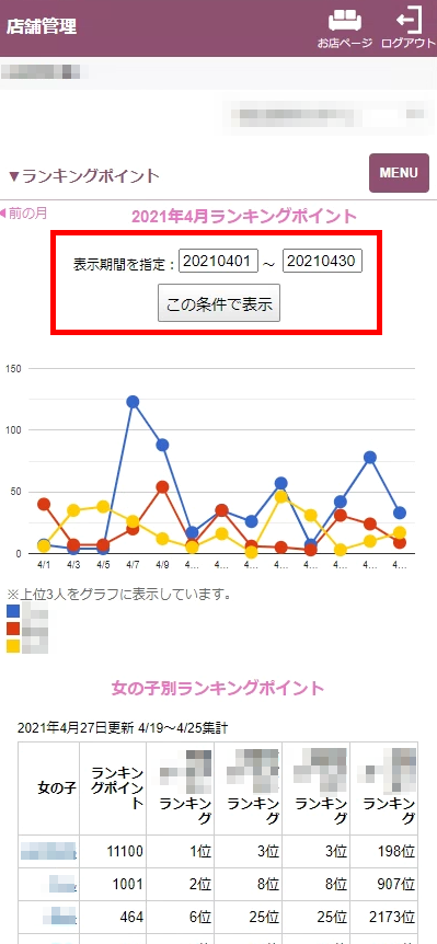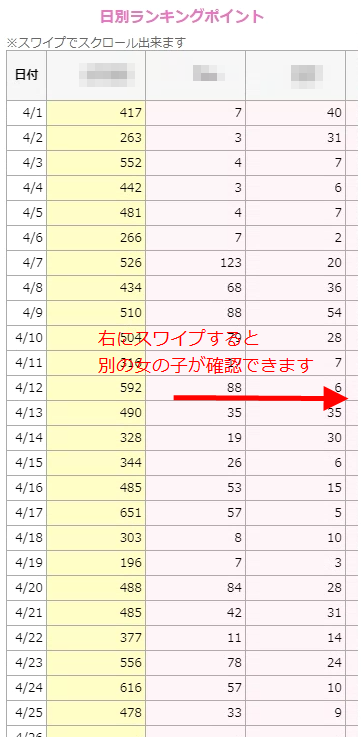 日付別・女の子別にランキングポイントを確認することができます。また、一日平均のランキングポイントも確認できます。
