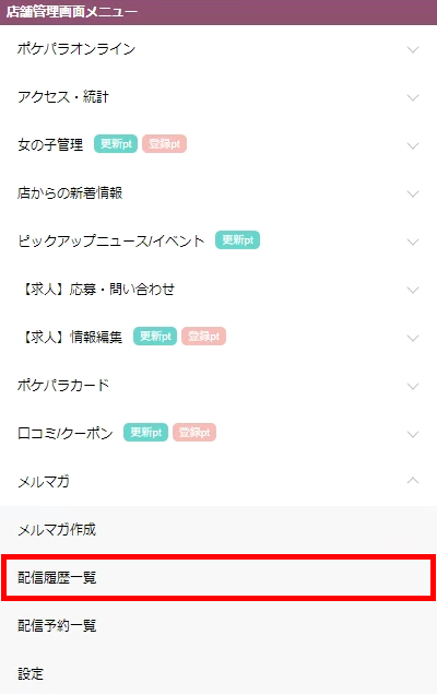 メルマガ配信履歴一覧が表示されます。※メルマガ機能をご希望の店舗は店舗担当者にご連絡ください。