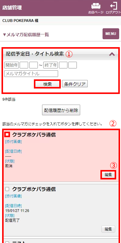 配信予定日とメルマガタイトルを入力して履歴から該当のメルマガを検索できます。