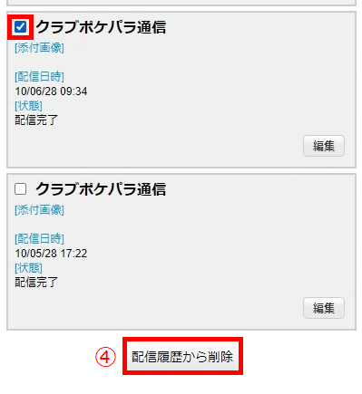 配信一覧から削除したいメルマガがある場合は削除したいメルマガにチェックを付け「配信履歴から削除」をクリックしてください。