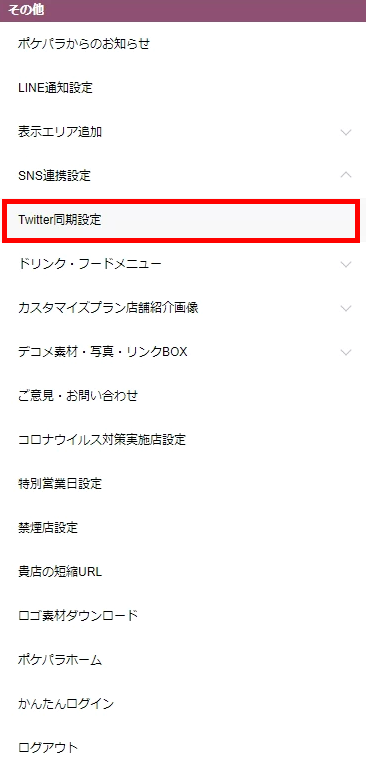 ▼トップメニューの【その他】の【SNS連携設定】の中に【Twitter同期設定】があります。