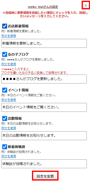 同時投稿したい項目にチェックを入れ、その際のメッセージを入力してください。設定が終わったら「設定変更」をクリックしてください。設定を変更しない場合は✕印で前の画面に戻ります。