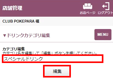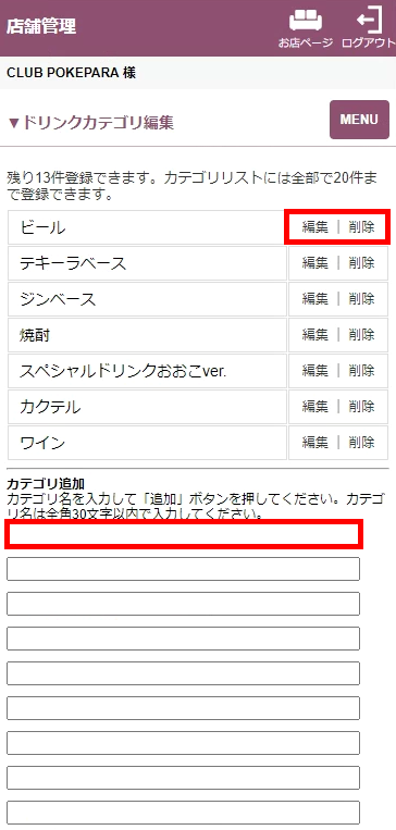 ドリンク・フードのカテゴリを追加・編集することができます。※こちらの項目が表示されていない場合は店舗担当者へご確認ください。