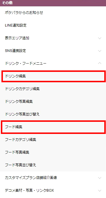 ▼トップメニューの【その他】の【ドリンク・フードメニュー】中に【ドリンク編集・フード編集】があります。