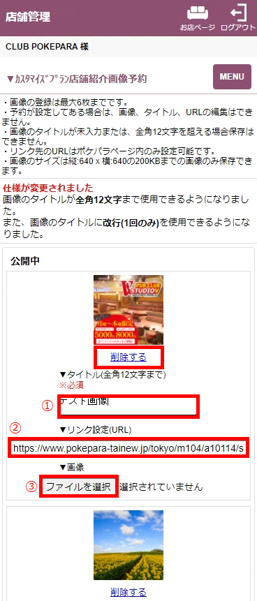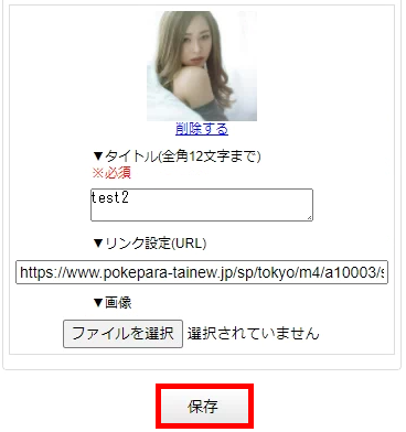 ※「削除する」をクリックするとタイトル、リンク設定、画像が削除されます。タイトル、リンク設定、画像のどれかだけを変更したい場合、削除せずにタイトルやURLを編集、もしくは変更したい画像の「ファイル選択」で新しい画像を選択し「保存」をクリックしてください。