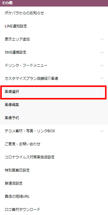 ▼トップメニューの【その他】の【カスタマイズプラン店舗紹介画像】中に【画像選択】があります。