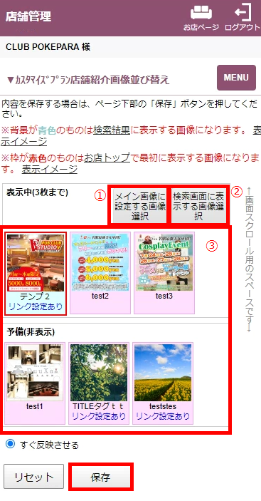 画像の選択、並び替えが終わったら必ず「保存」をクリックしてください。元に戻す場合は「リセット」をクリックすると現在表示中の画像選択、並び順に戻ります。