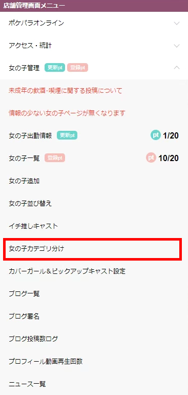 ▼トップメニューの【女の子管理】の中に【女の子カテゴリ分け】があります。