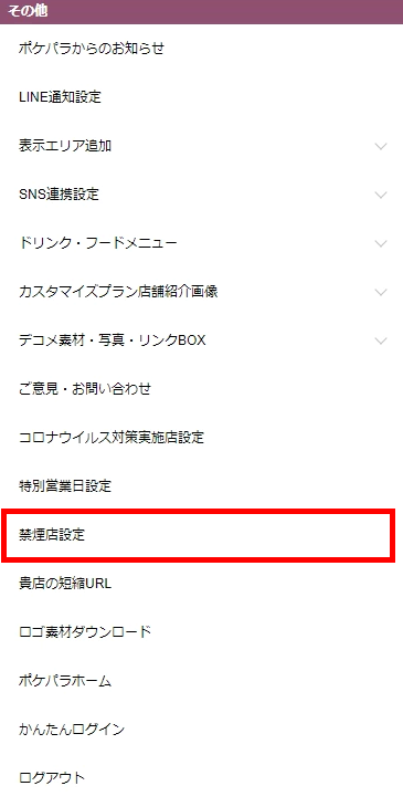 ▼トップメニューの【その他】の中に【禁煙店設定】があります。