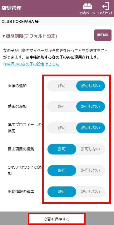 ※こちらの設定はデフォルト設定のため新しく追加する女の子に適用されます。作成済みの女の子の設定は機能制限(女の子ごとに設定)にて設定を確認・変更してください。