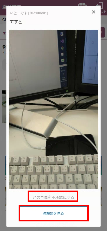 不承認に変更する場合は「この写真を不承認にする」をタップしてください。体験談を見るをタップすると投稿を確認することができます。